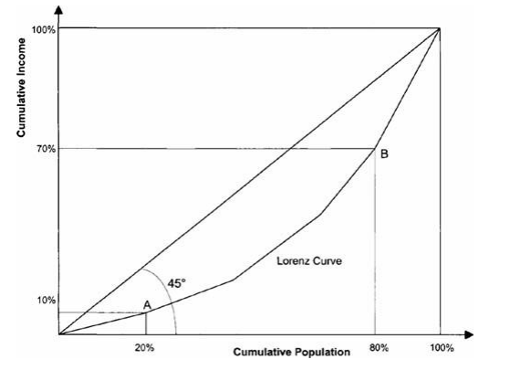 - The Lorenz curve begins and ends on a 45° line: the poorest 0% earn 0% of national income by definition, whereas the poorest 100% is the whole population and must earn 100% of income.