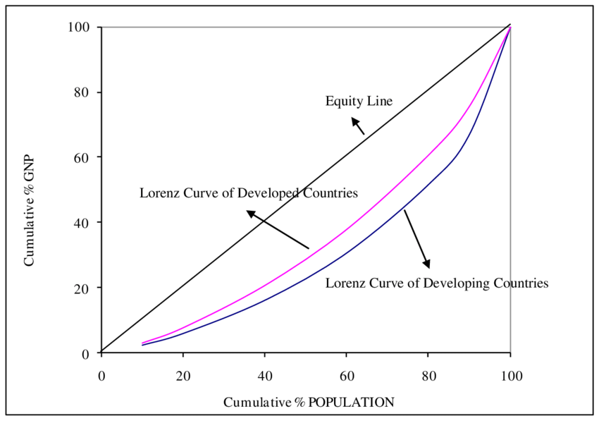 - The Lorenz curve of the developed countries will be closer to the 45° line and the Lorenz curve of the developing countries will be further.