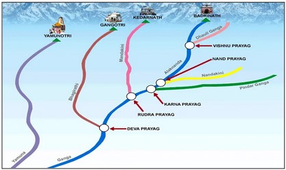 - Karnaprayag: Confluence of Pindar river and Alaknanda river.