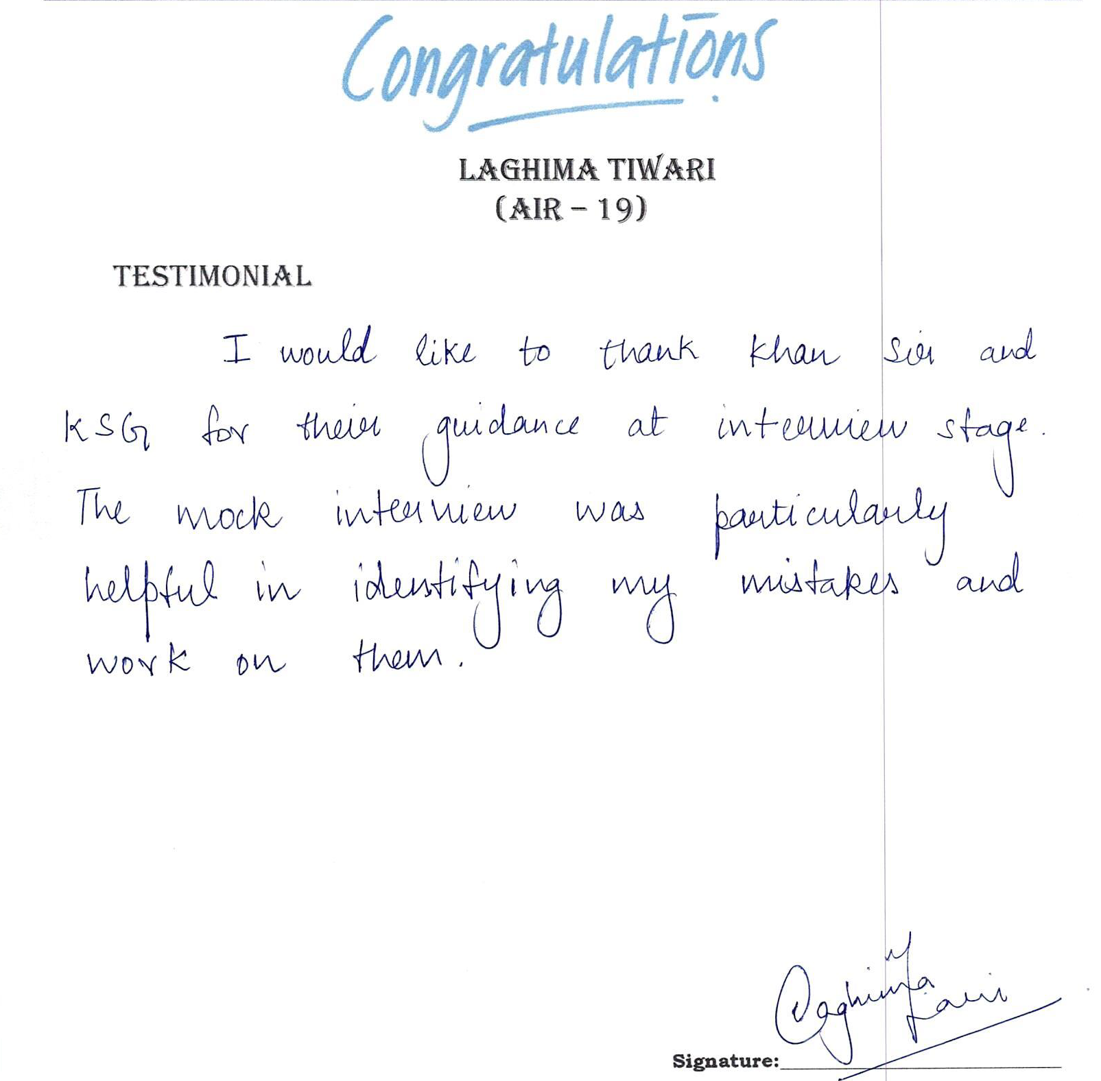 KSG wishes LAGHIMA TIWARI for her 19th rank in UPSC CSE 2022-23. She was born in Alwar, Rajasthan and her family hails from Alwar, Rajasthan. She attended New Green Field School, Saket, New Delhi and she pursued a Bachelor of technology degree in Electronics and Communication Engineering at Delhi Technological University, NEW DELHI. She attempted the civil services exam in English Medium with ANTHROPOLOGY as her Optional Subject. We wish her once again for her future endeavours. |
